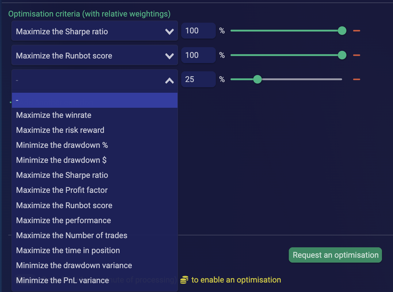 **Optimize Critical Performance Criteria:** Focus on the most important metrics that align with your trading goals. Use the Optimiser’s weighting feature to give more importance to parameters that significantly impact your strategy’s success. This allows for a more targeted optimization process, improving aspects like profitability, risk management, and overall strategy stability.