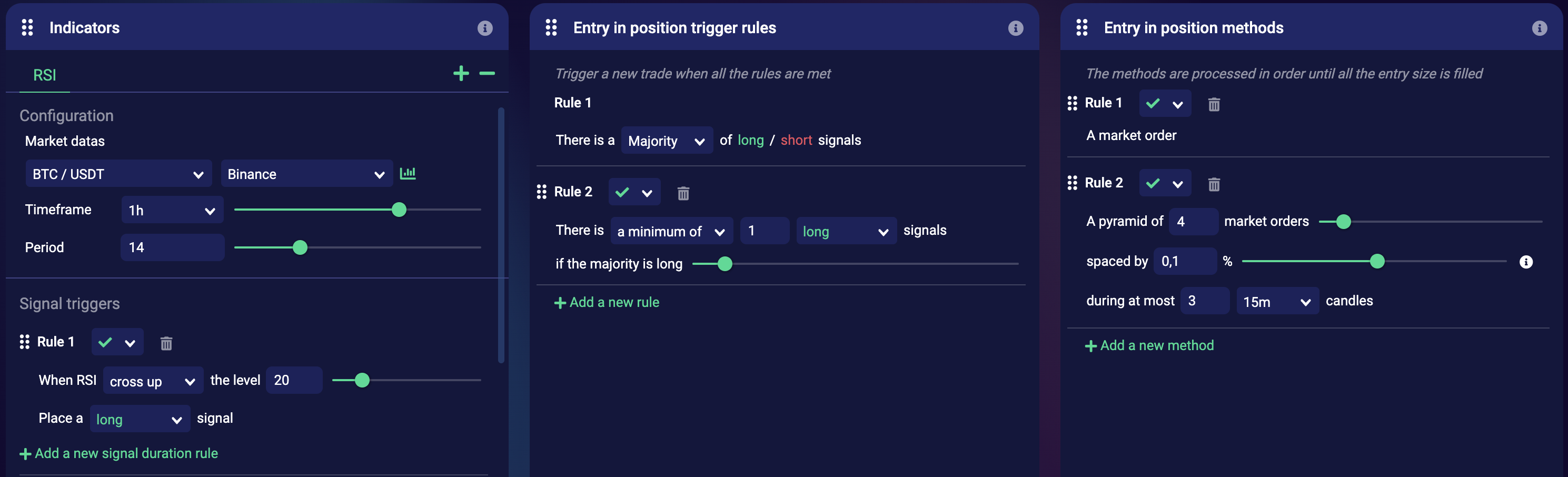 <figure><img src="https://793384675-files.gitbook.io/~/files/v0/b/gitbook-x-prod.appspot.com/o/spaces%2FsQezxfp9oB9jrccv5OA4%2Fuploads%2FXdyV7DVzJZd8IAq0n54h%2Fimage.png?alt=media&#x26;token=22b79eb1-9069-4d03-bf05-941964ea80d0" alt=""><figcaption><p>When the RSI cross up the lvl 20, the indicator will trigger a Long Signal that will be used by the Entry in position rules Box. When at least 1 long signal appears, a pyramid market order will be executed to open a long position.</p></figcaption></figure>