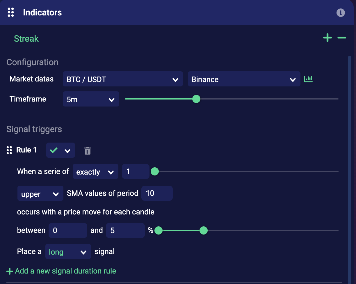 <figure><img src="https://793384675-files.gitbook.io/~/files/v0/b/gitbook-x-prod.appspot.com/o/spaces%2FsQezxfp9oB9jrccv5OA4%2Fuploads%2Fkkevpxm7zLWwe3bBPcDS%2Fimage.png?alt=media&#x26;token=01060571-48b6-4026-9c81-f8a0b2afefdf" alt="" width="563"><figcaption><p><strong>In this example, we want to long once exactly 1 SMA value of period 10 is green.</strong></p></figcaption></figure>