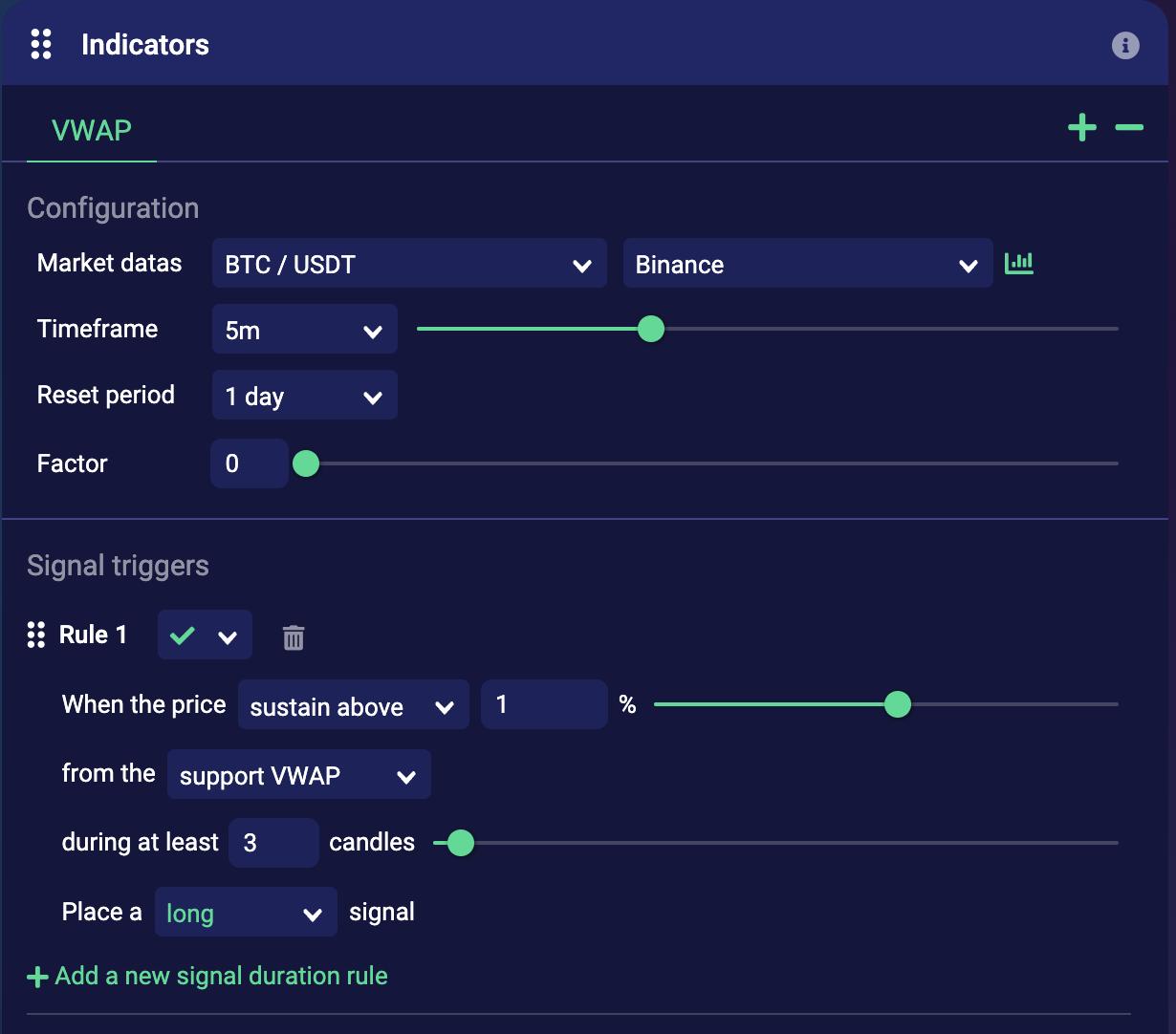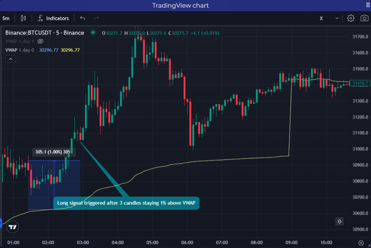 <figure><img src="https://793384675-files.gitbook.io/~/files/v0/b/gitbook-x-prod.appspot.com/o/spaces%2FsQezxfp9oB9jrccv5OA4%2Fuploads%2F9Og9QCdZnzyN1srFRpS5%2Fimage.png?alt=media&#x26;token=2a4fe1b5-594a-447d-9e21-6bdf457df31a" alt="" width="563"><figcaption><p>A long signal is triggered if price sustain above 1% above daily VWAP for at least 3 candles of 5 minutes.</p></figcaption></figure>