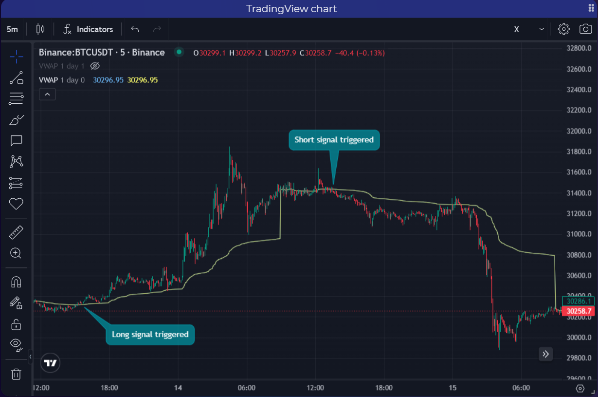 <figure><img src="https://793384675-files.gitbook.io/~/files/v0/b/gitbook-x-prod.appspot.com/o/spaces%2FsQezxfp9oB9jrccv5OA4%2Fuploads%2FWzjOJI6kC1cbIQ3vQrIO%2FVWAP_Cross_up_down_TVchart.png?alt=media&#x26;token=e895ff83-35d1-4cf7-8a21-7bb98c4a10d9" alt=""><figcaption><p><strong>A long &#x26; short signal are triggered just after the price crossed up then down the VWAP during 1 candle time, and not all the time when price is higher or lower.</strong></p></figcaption></figure>