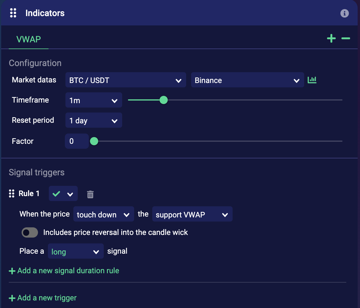 <figure><img src="https://793384675-files.gitbook.io/~/files/v0/b/gitbook-x-prod.appspot.com/o/spaces%2FsQezxfp9oB9jrccv5OA4%2Fuploads%2Fc7VNRPfa4J57Ui9pWKbg%2Fimage.png?alt=media&#x26;token=51272008-f6d5-4fa8-a959-baa16ad87ec1" alt="" width="563"><figcaption><p>A long signal is triggered if price touch down the daily VWAP line.</p></figcaption></figure>